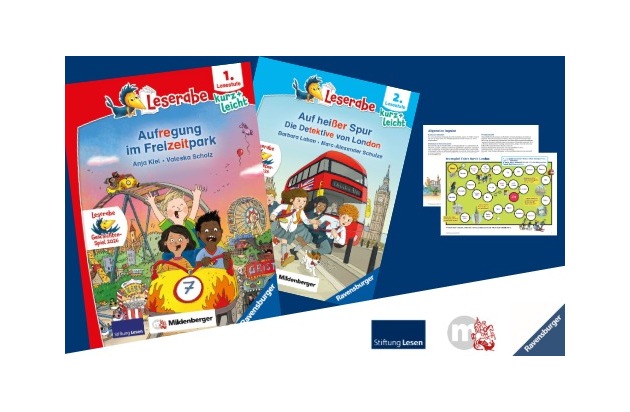 Mainz/Ravensburg, 24. Februar 2026. Fantastische Protagonisten, spannende Geschichten, die Silbenschreibweise zum leichteren Lesen lernen, Rätselfragen zum Textverständnis sowie begleitende Arbeitsblätter zur Vertiefung – das sind die Bestandteile des Leseförderkonzepts für Leseanfänger*innen. Das Leserabe Geschichten-Spiel 2026 umfasst je ein Erstlesebuch für die erste und für die zweite Lesestufe und nimmt die Leserinnen und Leser dieses Jahr mit auf spannende Schulausflüge. Beide Titel stellt der Ravensburger Verlag in einer Originalfassung und zusätzlich in einer vereinfachten Version mit weniger Text und kürzeren Sätzen zur Verfügung. Die Originalausgaben und die vereinfachten Varianten der Leserabe Bücher sind identisch illustriert. Auf diese Weise kann in Lerngruppen mit unterschiedlichen Leseniveaus mit der gleichen Geschichte gearbeitet werden. Der Mildenberger Verlag hat alle Lesetexte mit dem farbigen Silbentrenner ausgestattet. Dieser verschafft eine wesentliche Erleichterung beim Erfassen von Silben und Wörtern. Begleitend zu den Geschichten stellt die Stiftung Lesen Unterrichtsmaterial zur Verfügung. Das digitale Format erlaubt den Lehrkräften einen flexiblen Einsatz am Tablet, dem interaktiven Whiteboard oder ausgedruckt.