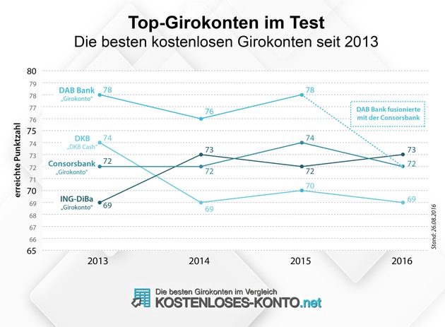 Als Gesamtsieger im Girokonto-Test 2016 setzte sich erstmals die ING-DiBa durch. Das kostenlose Girokonto mit gebührenfreier Kreditkarte erzielte 73 von 100 Punkten. Vor allem mit dem Verzicht auf einen Mindestgehaltseingang und 0,00 Euro monatlichen Kontoführungsgebühren punktet das Girokonto. Den 1. Platz knapp verfehlt hat in diesem Jahr die Consorsbank, die 72 Punkte erreichte - zwei Punkte weniger als im Vorjahr. Drei Banken teilen sich den 3. Platz, darunter überraschenderweise eine Filialbank. Die Santander Bank erhielt 69 Punkte. Ebenfalls diesen Wert erreichten das Wüstenrot "Top-Giro" und das DKB Cash Girokonto.