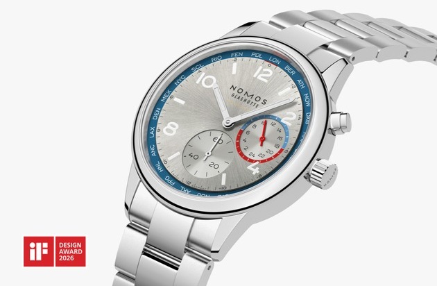 Die Uhrenmanufaktur NOMOS Glashütte wurde mit dem iF Design Award 2026 in der Kategorie Produktdesign ausgezeichnet. Prämiert wurde das Modell Club Sport neomatik Weltzeit silber. Für NOMOS ist es bereits der 13. iF Design Award seit 2012.