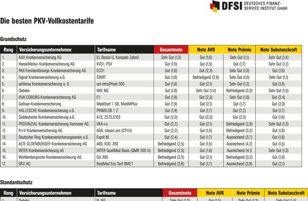 Die DFSI Deutsches Finanz-Service Institut GmbH hat Privater Krankenversicherungen auf drei Tarifniveaus untersucht. Beim Grundschutz kam die AXA auf Platz 1, beim Standardniveau schnitt die Debeka am besten ab, beim Premiumschutz lagen AXA und Inter punktgleich vorn.