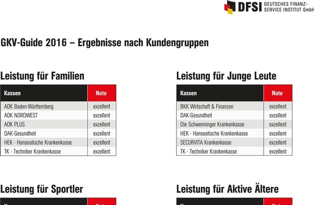 Viele Gesetzliche Krankenkassen bieten mehr als gesetzlich vorgeschrieben. Die DFSI Deutsches Finanz-Service Institut GmbH hat deshalb für acht Modellkunden untersucht, welche Kassen das beste Angebot haben. Insgesamt konnte 35-mal die Bestnote "Exzellent" vergeben werden. Mit AOK Plus, DAK Gesundheit, HEK - Hanseatischer Krankenkasse, TK - Techniker Krankenkasse und Securvita Krankenkasse schafften es fünf Kassen, mehrfach mit der Bestnote ausgezeichnet zu werden. Zudem wurde in einer Langzeitbetrachtung ermittelt, welche Kassen seit Jahren für bestimmte Modellkunden bestens geeignet sind.