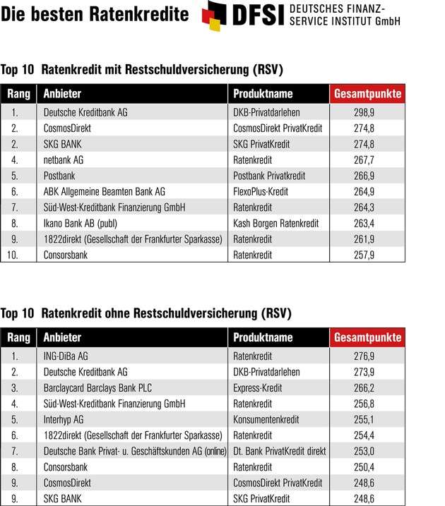 "Berücksichtigt man alle Zins-, Kosten- und Gebührenkomponenten, dann ist unter allen untersuchten Ratenkrediten das DKB-Privatdarlehen der Deutschen Kreditbank für diejenigen am günstigsten, die ihre Ratenzahlungen über eine Restschuldversicherung absichern möchten", erklärt Lemke. Auf Platz zwei kam hier der Privatkredit der CosmosDirekt, punktgleich mit dem PrivatKredit der SKG Bank. Wer dagegen keine Restschuldversicherung abschließen will, kommt bei Betrachtung aller Kostenfaktoren mit dem Ratenkredit der ING-Diba am günstigsten weg. Auf Platz zwei liegt auch hier das DKB-Privatdarlehen. Und auf Platz drei folgt der Express-Kredit von Barclaycard Barclays Bank. Übrigens: Die Produkte von ING-Diba und Barclaycard Barclays Bank sind grundsätzlich nur ohne RSV erhältlich.
