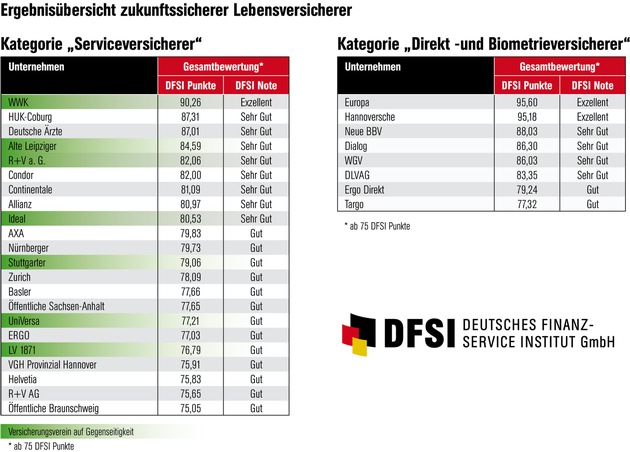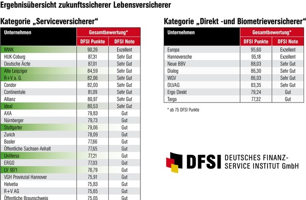 Und das Ergebnis der DFSI-Studie? Unterm Strich schnitten mit dem Serviceversicherer WWK und den beiden Direktversicherern Europa und Hannoversche drei Unternehmen "Exzellent" ab. Acht Serviceversicherer, vier Direkt- oder Biometrie-Versicherer sowie zwei Run-Offs - also Versicherer, die das Neugeschäft bereits eingestellt haben - erhielten die Gesamtnote "Sehr Gut". Mit "Gut" wurden 32 Service-, drei Direkt- oder Biometrie-Versicherer und zwei Run-Offs bedacht. 13 Service-Versicherer und zwei Run-Offs sind in Sachen Zukunftssicherheit insgesamt gerade mal "Befriedigend". Die beiden Service-Versicherer RheinLand Versicherungen und Debeka sowie der Run-Off Athene schafften sogar nur ein "Ausreichend".
