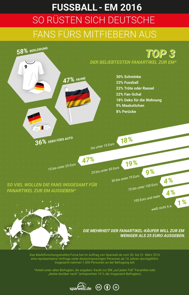 "Wer sich zur Fußball-EM mit Fanartikeln eindeckt, greift am ehesten zu Bekleidung (58 %) wie T-Shirts, Pullovern oder Mützen", sagt Dr. Tim Seewöster von Sparwelt.de. Jeder Zweite (47 %) plant eine Deutschlandfahne zu kaufen, jeder Dritte (36 %) Deko fürs Auto. Deutschlandfahnen, Autofähnchen und Überzüge für den Außenspiegel werden daher wohl in den nächsten Wochen wieder zum Straßenbild gehören.