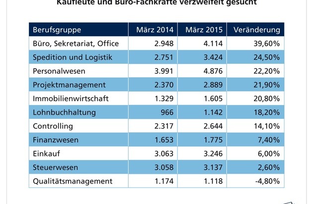 Die Nachfrage nach qualifizierten Fachkräften für kaufmännische Berufe und Bürofachkräfte ist in den letzten Monaten stark gestiegen. Das ist das Ergebnis einer Analyse des Stellenmarktes in Deutschland durch den Weiterbildungsspezialisten WBS Training. Danach stieg die Nachfrage für einige Berufe, zum Beispiel im Bereich Sekretariat, Büro, Office-Management, innerhalb eines Jahres um bis zu 40 Prozent, im Personalwesen um 22 Prozent, bei Spedition und Logistik um rund 25 Prozent und in der Immobilienwirtschaft um fast 21 Prozent. Aber auch in den Bereichen Lohnbuchhaltung (+ 18,2 %), Controlling (+ 14,1 %) oder Finanzwesen (+ 7,4 %) waren noch deutliche Steigerungsraten zu beobachten. Die Analyse des Stellenmarktes basiert auf der Analyse der Stellenanzeigen in 197 Stellenbörsen im Internet, in Zeitungen und Zeitschriften in den Monaten März 2014 und März 2015. Die Ergebnisse werden im "JobReport Kaufmännische Berufe" der WBS Training veröffentlicht.