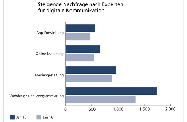 Deutsche Unternehmen suchen verstärkt Fachleute und Spezialisten für die Onlinekommunikation in den Bereichen Webdesign, Online-Marketing und App-Entwicklung. Das ist das Ergebnis einer aktuellen Untersuchung des Stellenmarktes durch den Weiterbildungsspezialisten WBS Training. Danach waren in den untersuchten Berufen aus den Bereichen Marketing/PR/Werbung/Multimedia im Januar 2017 9.500 Stellen ausgeschrieben, ein Zuwachs von über 16 Prozent gegenüber dem Vorjahreszeitraum. Die Online-Spezialisten werden dabei nicht nur von Verlagen und Online-Händlern (zum Beispiel Amazon, C&A oder Zalando) gesucht, sondern verstärkt von immer mehr Unternehmen aus nahezu allen Branchen (zum Beispiel Allianz, Daimler oder Hilti). Neben Online-Marketing-Experten, mit 650 Stellenangeboten, wurden im Auswertungszeitraum Januar 2017 vor allem Webprogrammierer mit Webdesign-Kenntnissen (1740), Mediengestalter (knapp 1.000), Online-Marketing-Experten (650) sowie App-Entwickler (560) gesucht. Bei den Webdesignern war der Anstieg mit über 30 Prozent besonders groß. Insgesamt hatten im Januar dieses Jahres rund 5.100 Unternehmen entsprechende Stellen ausgeschrieben.
