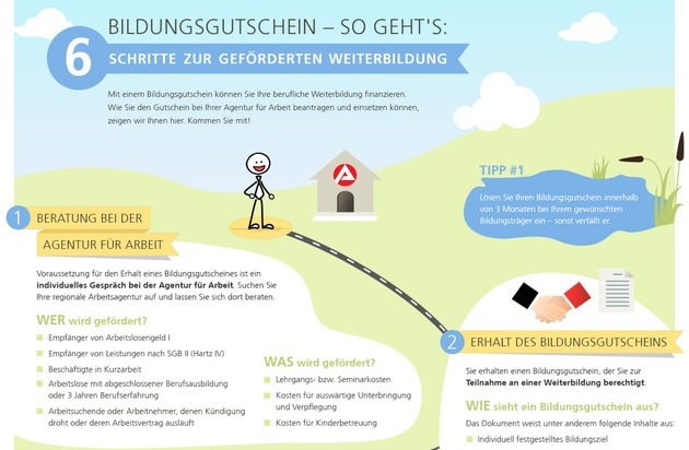 Um diesen erfolgreich zu beantragen, gilt es jedoch, ein paar wichtige Schritte zu beachten. In seinem Blog "Hallo Karriere!" gibt der Weiterbildungsexperte WBS Training eine Schritt-für-Schritt-Anleitung. So beginnt alles mit einem Beratungsgespräch im Jobcenter, bei dem die Weichen für die zukünftige berufliche Orientierung gestellt werden. Was man hierfür vorbereiten sollte, wo man seinen Bildungsgutschein einlöst, wie man weitere Informationen findet und weitere hilfreiche Tipps liefern ein übersichtlich aufbereiteter Artikel und eine anschauliche Infografik.