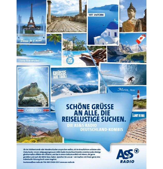 Die Tourismus-Branche wächst. Ihr Anteil an der gesamtwirtschaftlichen Leistung liegt in Deutschland mittlerweile bei rund 64 Milliarden Euro. Über 70 Prozent der Deutschen zieht es im Jahr in die Ferne. Und immer mehr Touristikunternehmen nutzen die Aktivierungskraft von Radiowerbung, denn 58 Millionen Deutsche hören werktags bis zu vier Stunden Radio, die Markenbekanntheit kann dabei effektiv gesteigert und das Profil positiv beeinflusst werden. Mit der neuen Tourismus-Broschüre der AS&S Radio gibt der Frankfurter Vermarkter Touristikanbietern und Agenturen starke Argumente für den Einsatz von Radiowerbung und verschafft einen schnellen Überblick über die Werbemöglichkeiten sowie die effiziente Steigerung von Markenbekanntheit und Verkaufszahlen im Hörfunk.