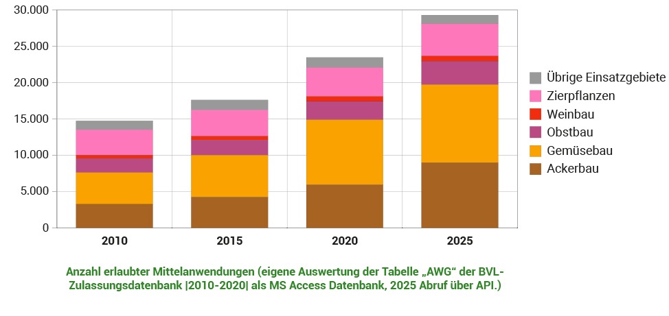 Die Anzahl der in Deutschland zugelassenen Wirkstoffe ist stabil, die genehmigten Mittel-Anwendungen haben sich in den letzten 15 Jahren sogar verdoppelt. Für tatsächlich weggefallene Pestizide ist die Industrie selbst verantwortlich, denn für mehr als die Hälfte dieser Stoffe wurden keine Anträge gestellt. Nur etwa ein Drittel der verschwundenen Stoffe wurde nicht mehr zugelassen, weil sie zu gefährlich für Mensch und Umwelt sind.