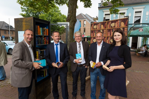 Seit 2011 stellt RWE Deutschland offene Bücherschränke an zentralen Plätzen in Städten und Gemeinden auf. Jetzt wird Jubiläum gefeiert: Der 99. und 100. Bücherschrank stehen seit diesem Samstag im niederrheinischen Schwalmtal. Gemeinsam eröffneten Ortsbürgermeister Michael Pesch und Dr. Heinz-Willi Mölders, Personalvorstand von RWE Deutschland, die beiden Bücherschränke.
