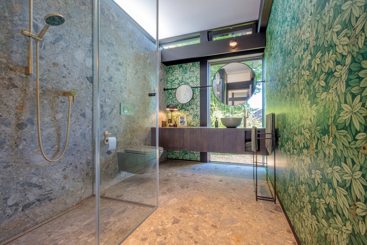 Auch glatt ausgeführte Innenwände sind auf Wunsch umsetzbar und verleihen den Räumen eine ebenso elegante Wirkung. Selbstverständlich kann der Innenputz in unterschiedlichen Farbtönen gestaltet werden. Wer beispielsweise im Badezimmer Boden- und Wandfliesen im einheitlichen Look wählt, erzeugt nahtlose Übergänge.