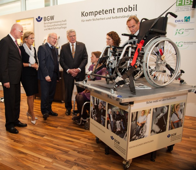 Bundespräsident Joachim Gauck hat sich auf dem Deutschen Fürsorgetag in Leipzig bei der Berufsgenossenschaft für Gesundheitsdienst und Wohlfahrtspflege (BGW) über die sichere Mobilität von Menschen mit Behinderungen informiert. Nach seiner Eröffnungsrede besuchte Gauck bei einem Rundgang den Stand der BGW. Dort erfuhr er, was Menschen mit Behinderungen benötigen, um sicher unterwegs zu sein und am beruflichen wie gesellschaftlichen Leben teilhaben zu können.