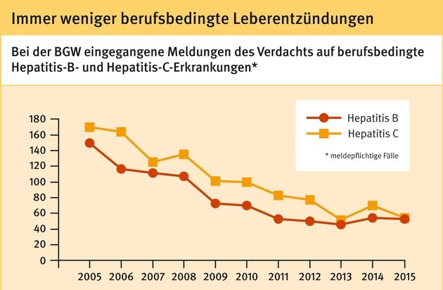 "Bei der Prävention von berufsbedingten blutübertragbaren Virushepatitiden sind durch vermehrte Impfungen und einen verbesserten Schutz vor Nadelstichverletzungen in den vergangenen Jahren große Erfolge erzielt worden", berichtet Prof. Dr. Albert Nienhaus, Leiter der Abteilung Arbeitsmedizin und Gesundheitswissenschaften der BGW. Die Zahl der bei der Berufsgenossenschaft eingegangenen meldepflichtigen Verdachtsanzeigen berufsbedingter Hepatitis-B-Erkrankungen sank zwischen 2005 und 2015 um rund 60 Prozent von 146 auf 57. Noch stärker ging die Meldung von Hepatitis-C-Erkrankungen an die BGW zurück: Hier fiel die Zahl der meldepflichtigen Verdachtsanzeigen von 168 im Jahr 2005 auf 53 im Jahr 2015.
