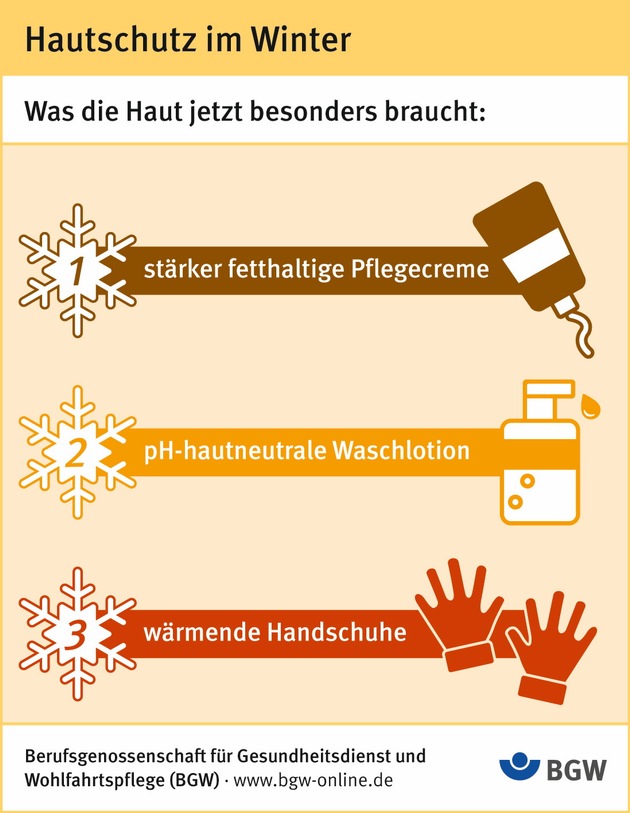 Die Heizungsluft drinnen und die niedrigen Temperaturen draußen machen der Haut im Winter zu schaffen. "Bei trockener warmer Innenluft gibt die Haut vermehrt Feuchtigkeit ab", erklärt Dr. Verena Kagel, Dermatologin bei der BGW. "Draußen leidet die Haut auf andere Weise: Bei Kälte wird sie schwächer durchblutet und produziert ihren natürlichen Fettfilm, der sie geschmeidig hält, nur eingeschränkt nach." Deshalb benötigt die Haut in den kalten Monaten besonderen Schutz und spezielle Pflege - im Beruf wie in der Freizeit.