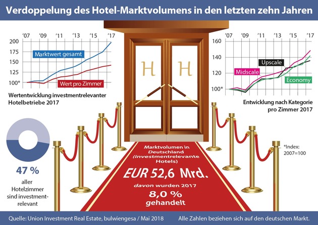 Als investmentrelevantes Angebot wurde von Union Investment und bulwiengesa ein Bestand von rund 375.200 Hotelzimmern ermittelt, die sich auf deutsche Klein-, Mittel- und Großstädte verteilen. Der durchschnittlich ermittelte Wert pro Zimmer lag 2017 bei rund 140.100 Euro. Im Vorjahr lag der entsprechende Wert noch bei 135.600 Euro.