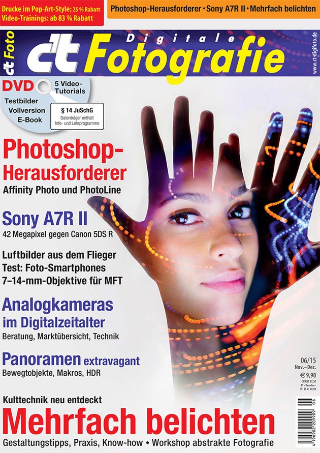 Das aktuelle Heft c't Digitale Fotografie 6/15 stellt außerdem die Photoshop-Alternativen Affinity Photo und PhotoLine auf den Prüfstand. Weiterer Schwerpunkt ist das Thema Analogkameras im Digitalzeitalter: Hier bietet die Redaktion eine umfangreiche Beratung sowie eine Marktübersicht zu gebrauchten und neuen Analogkameras, die nach wie vor gefragt sind.