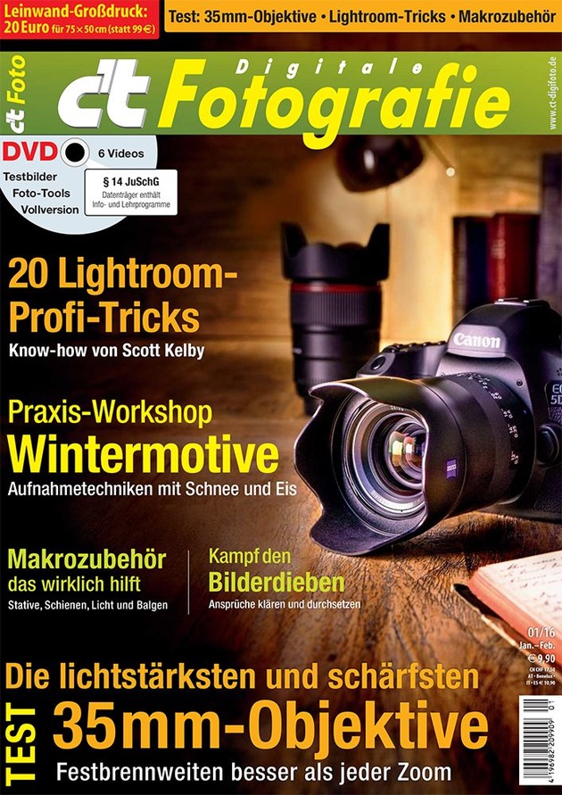 Das aktuelle Heft c't Fotografie 1/16 vergleicht außerdem die hochwertigen Brigde-Kameras Sony RX10 Mark II und Canon G3 X, zeigt, welches Makrozubehör tatsächlich hilft, und erklärt, wie man seine Urheberrechte schützen kann.