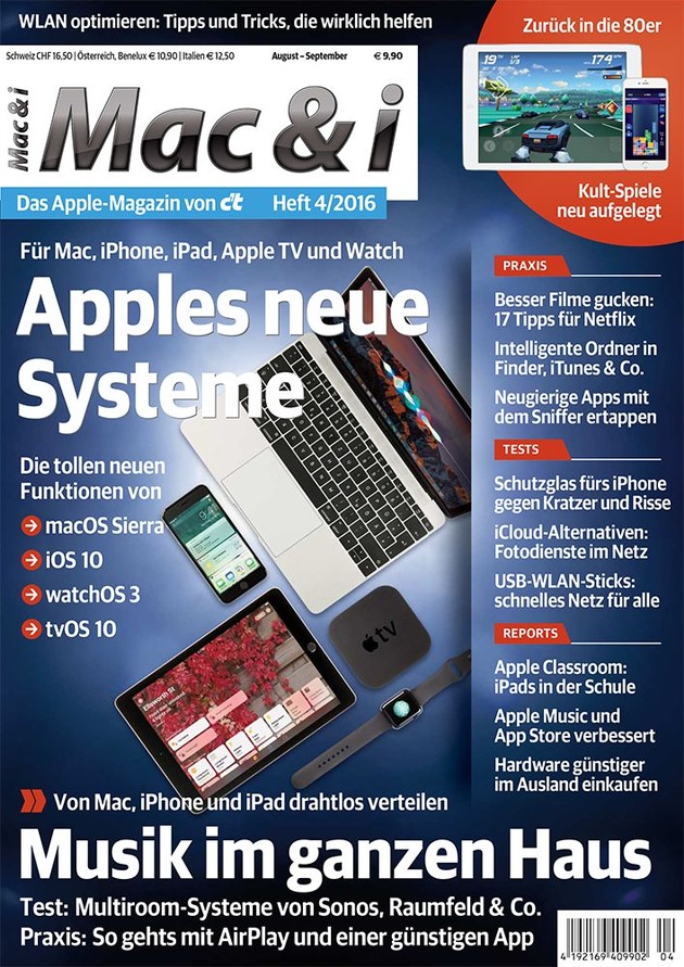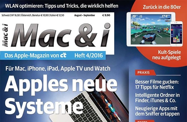 Mac & i gibt im neuen Heft 4/16 noch viele weitere Tipps für Netflix-Fans. Weitere Schwerpunktthemen sind Apples neue Systeme und Musik im ganzen Haus.