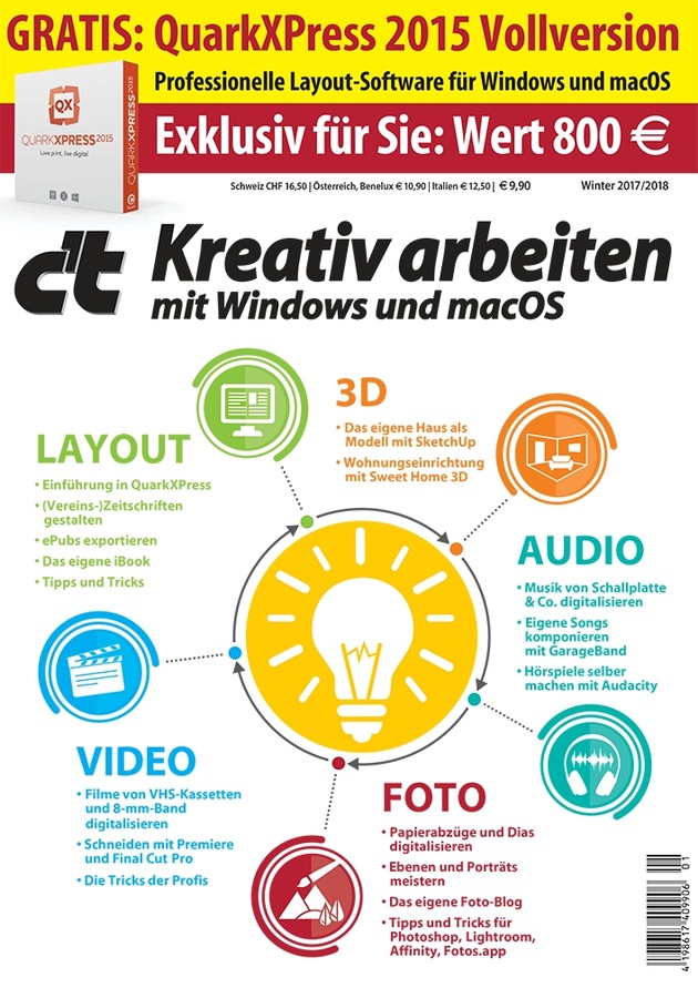 Ob Layout, Audio, Video, Foto oder 3D: Kreative kommen mit dem neuen c't-Sonderheft voll auf ihre Kosten. Für nur 9,90 Euro erhalten sie auf 164 Seiten neben vielen Tipps, Workshops und Praxisartikeln eine exklusive Vollversion von QuarkXPress im Wert von 800 Euro. Die Layout-Software lässt sich auf bis zu zwei Rechnern sowohl unter Windows als auch unter macOS nutzen.