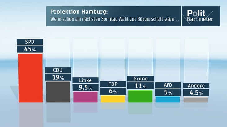 Wenn schon am nächsten Sonntag gewählt würde, dann ergäben sich die folgenden Projektionswerte für die Parteien: Die SPD käme zurzeit auf 45 Prozent, die CDU auf 19 Prozent, die Linke auf 9,5 Prozent, die FDP auf 6 Prozent, die Grünen auf 11 Prozent und die AfD auf 5 Prozent. Die anderen Parteien liegen zusammen bei 4,5 Prozent.