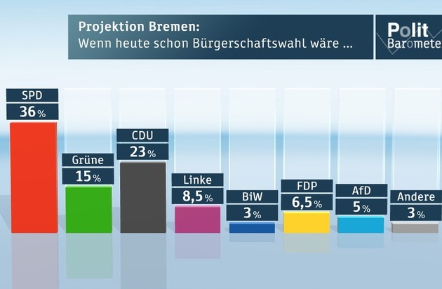 Projektion Bremen: Wenn schon jetzt Bürgerschaftswahl wäre, dann käme die SPD auf 36 Prozent (minus 1 im Vergleich zur letzten Woche), die Grünen auf 15 Prozent (unverändert), die CDU auf 23 Prozent (unverändert), die Linke auf 8,5 Prozent (minus 0,5), die Bürger in Wut (BIW) auf 3 Prozent (unverändert), die FDP auf 6,5 Prozent (plus 1,5) und die AfD auf 5 Prozent (unverändert). Die anderen Parteien kämen zusammen auf 3 Prozent (unverändert).