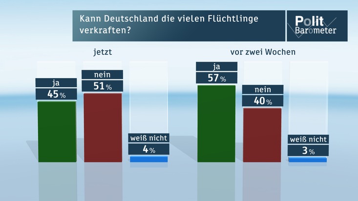 Waren vor zwei Wochen noch 57 Prozent der Deutschen der Meinung, dass die vielen Flüchtlinge, die zu uns kommen, verkraftet werden können, und nur 40 Prozent in dieser Hinsicht skeptisch, so haben sich die Mehrheitsverhältnisse inzwischen geändert: Jetzt glauben nur noch 45 Prozent, dass Deutschland die große Zahl an Flüchtlingen verkraften kann, 51 Prozent sehen das nicht so (Rest zu 100 Prozent hier und im Folgenden jeweils "weiß nicht").