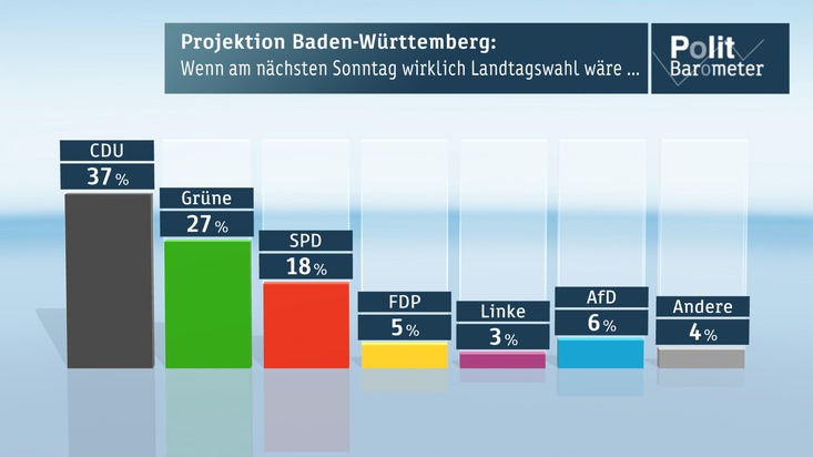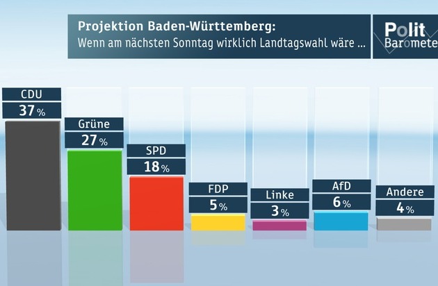 In Baden-Württemberg ist die CDU knapp vier Monate vor der Landtagswahl zwar klar stärkste Partei, an ihre frühere Stärke im "Musterländle" kommt sie aber nicht mehr heran. Die Grünen bleiben zweitstärkste Partei, der SPD drohen im Vergleich zu ihrem Ergebnis von 2011 deutliche Verluste. AfD und auch die FDP hätten jetzt eine Chance, die Fünf-Prozent-Hürde zu überspringen.