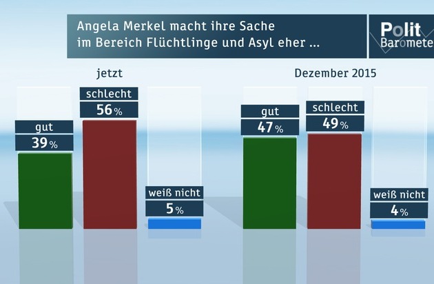 Waren im Dezember die Meinungen darüber noch annähernd geteilt, ob Angela Merkel in der Flüchtlingspolitik einen guten Job macht oder nicht, so äußert jetzt eine eindeutige Mehrheit ihre Unzufriedenheit: 56 Prozent (Dez.: 49 Prozent) sagen, sie macht in diesem Bereich ihre Arbeit eher schlecht, und nur noch 39 Prozent (Dez.: 47 Prozent) geben ein positives Urteil ab.