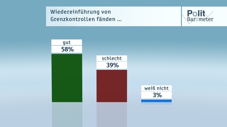 Eine Mehrheit von 58 Prozent fände es gut, wenn es wegen der Flüchtlingskrise wieder Grenzkontrollen gäbe, auch wenn dadurch das Reisen und der Güterverkehr in Europa erschwert werden. 39 Prozent sprechen sich gegen eine Wiedereinführung von Grenzkontrollen aus, die im Rahmen des Schengen-Abkommens zwischen den meisten europäischen Ländern abgeschafft wurden (Rest zu 100 Prozent hier und im Folgenden "weiß nicht"). Im Detail befürworten 51 Prozent der CDU/CSU-Anhänger, 49 Prozent der SPD- und 45 Prozent der Linke-Anhänger Grenzkontrollen. Von den Anhängern der Grünen unterstützen dies nur 26 Prozent, während in der Anhängerschaft der FDP (61 Prozent) und vor allem der AfD (90 Prozent) klare Mehrheiten dafür sind.