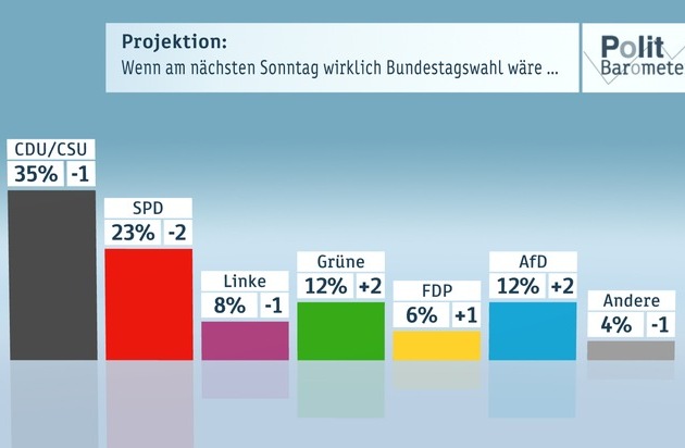 In der Woche nach den drei Landtagswahlen haben Grüne und AfD die größten Zugewinne, während CDU/CSU, SPD und Linke Verluste zu verzeichnen haben. Wenn am nächsten Sonntag wirklich Bundestagswahl wäre, käme die CSU/CSU auf 35 Prozent (minus 1), die SPD auf 23 Prozent (minus 2) und die Linke auf 8 Prozent (minus 1). Die Grünen könnten sich mit 12 Prozent (plus 2) deutlich verbessern, auch die FDP könnte leicht zulegen auf 6 Prozent (plus 1) und die AfD erreicht mit 12 Prozent (plus 2) ihren besten Wert im Politbarometer. Die anderen Parteien erzielten zusammen 4 Prozent (minus 1). Damit würde es bei zwei Koalitionspartnern nur für eine große Koalition aus CDU/CSU und SPD reichen, von den politisch denkbaren Dreierbündnissen gäbe es nur eine Mehrheit für Schwarz-Grün-Gelb.