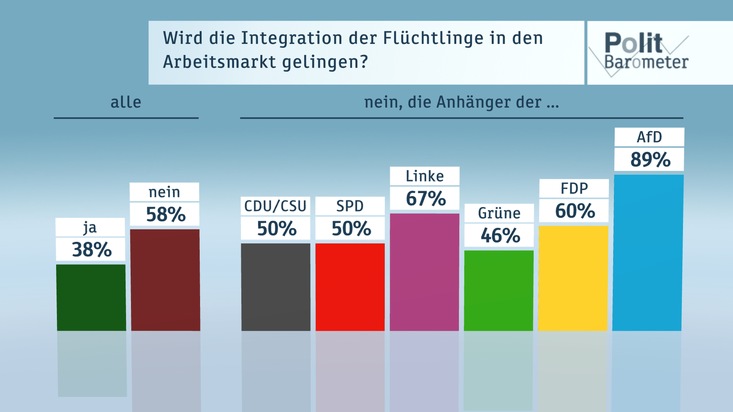 Die meisten Befragten (58 Prozent) bezweifeln, dass ein großer Teil der Flüchtlinge in den nächsten Jahren bei uns in den Arbeitsmarkt integriert werden kann. 38 Prozent glauben, dass das gelingen wird (Rest zu 100 Prozent hier und im Folgenden "weiß nicht"). Besonders große Zweifel melden hier die Anhänger der AfD (89 Prozent) und der Linken (67 Prozent) an. Generell sind 38 Prozent der Meinung, dass für die Eingliederung der Flüchtlinge in Deutschland zu wenig getan wird, 37 Prozent halten den Aufwand für gerade richtig, und 17 Prozent finden, es wird zu viel getan. Gleichzeitig bemängeln 51 Prozent fehlenden Integrationswillen seitens der Flüchtlinge, nur 25 Prozent glauben, dass sich die hier lebenden Flüchtlinge ausreichend um ihre Integration bemühen, und ein vergleichsweise hoher Anteil (24 Prozent) kann das nicht beurteilen.