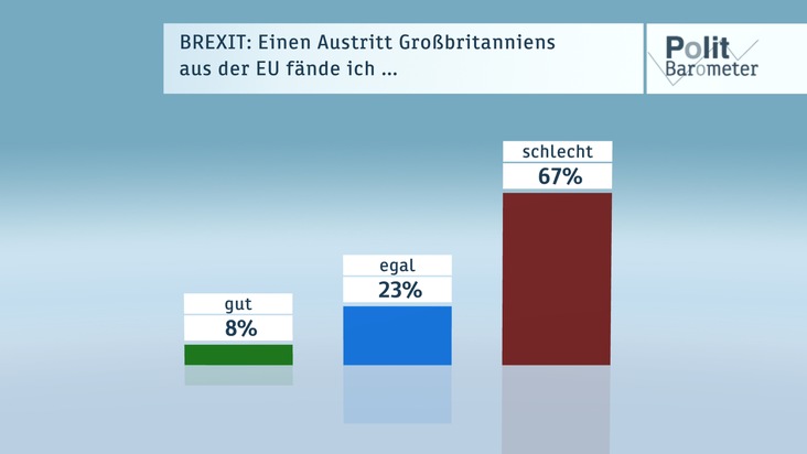 In knapp drei Wochen entscheidet Großbritannien, ob es aus der EU austritt oder Mitglied bleibt. Lediglich 8 Prozent der Befragten in Deutschland fänden den so genannten Brexit gut, 23 Prozent ist der Verbleib Großbritanniens egal, und 67 Prozent wollen, dass das Vereinigte Königreich Mitglied der EU bleibt (Rest zu 100 Prozent hier und im Folgenden "weiß nicht"). Die Angst, dass ein Austritt Großbritanniens zu größerem wirtschaftlichen Schaden für Deutschland führt, ist nicht so stark verbreitet: Einen sehr großen ökonomischen Schaden für Deutschland erwarten nur 4 Prozent und 29 Prozent einen großen. 44 Prozent hingegen glauben, dass das nicht zu so einem großen und 11 Prozent, dass es zu überhaupt keinem wirtschaftlichen Schaden für Deutschland führen würde.