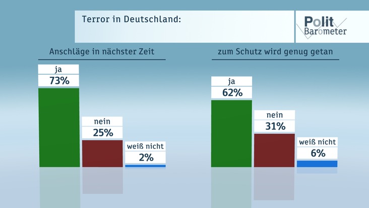 Nach den jüngsten Ereignissen in Chemnitz und dem offensichtlich vereitelten Terroranschlag sind jetzt 73 Prozent der Befragten der Meinung, dass es in nächster Zeit zu Terroranschlägen in Deutschland kommen wird, 25 Prozent glauben das nicht (Rest zu 100 Prozent hier und im Folgenden "weiß nicht" bzw. "egal"). Im Vergleich zum Juli nach dem Anschlag in Nizza hat sich damit die Einschätzung der deutschen Bevölkerung kaum verändert. Damals erwarteten 77 Prozent Terroranschläge auch bei uns, und 20 Prozent sahen das nicht so. Ebenfalls fast unverändert meint eine klare Mehrheit von 62 Prozent (Juli: 59 Prozent), dass in Deutschland genug zum Schutz vor Anschlägen getan werde, unverändert 31 Prozent sehen da Defizite.