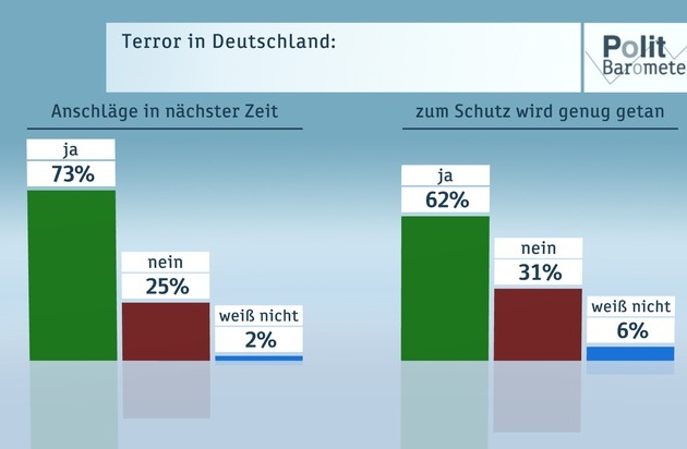 Nach den jüngsten Ereignissen in Chemnitz und dem offensichtlich vereitelten Terroranschlag sind jetzt 73 Prozent der Befragten der Meinung, dass es in nächster Zeit zu Terroranschlägen in Deutschland kommen wird, 25 Prozent glauben das nicht (Rest zu 100 Prozent hier und im Folgenden "weiß nicht" bzw. "egal"). Im Vergleich zum Juli nach dem Anschlag in Nizza hat sich damit die Einschätzung der deutschen Bevölkerung kaum verändert. Damals erwarteten 77 Prozent Terroranschläge auch bei uns, und 20 Prozent sahen das nicht so. Ebenfalls fast unverändert meint eine klare Mehrheit von 62 Prozent (Juli: 59 Prozent), dass in Deutschland genug zum Schutz vor Anschlägen getan werde, unverändert 31 Prozent sehen da Defizite.