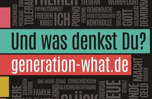 Noch bis Ende November können junge Menschen zwischen 18 und 34 Jahren auf www.generation-what.de an der Umfrage teilnehmen: Sie umfasst 149 Fragen von Politik über Religion bis hin zu Sexualität und Lebensglück. Das Ziel: Die 18- bis 34-jährigen Europäer sollen die Chance erhalten, selbst ein Bild ihrer Generation zu zeichnen. Koordiniert wird "Generation What?" von der Europäischen Rundfunkunion (EBU). In Deutschland begleitet das ZDF zusammen mit dem BR und dem SWR das Projekt. Ende November wird das SINUS-Institut in Kooperation mit den Sendern und in Zusammenarbeit mit Soziologen aus ganz Europa anhand einer repräsentativ gezogenen Stichprobe die Endergebnisse zum Projekt "Generation What?" vorstellen.