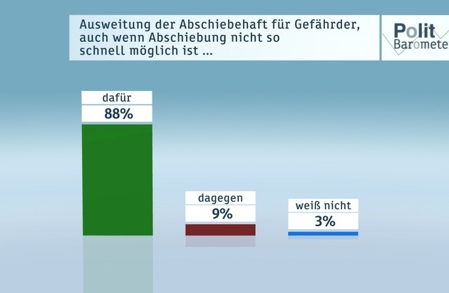 Diese Woche haben sich Justizminister Heiko Maas und Innenminister Thomas de Maizière auf verschiedene Maßnahmen als Folge des Terroranschlags im Dezember geeinigt. So sollen in Zukunft Asylbewerber, die aufgrund von Kontakten zu Terrororganisationen als so genannte Gefährder eingestuft werden, länger als bisher in Abschiebehaft genommen werden können, auch wenn so schnell keine Abschiebung in ihr Heimatland möglich ist. Eine solche Ausweitung der Abschiebehaft für Gefährder wird von 88 Prozent aller Befragten gutgeheißen und lediglich von 9 Prozent abgelehnt.