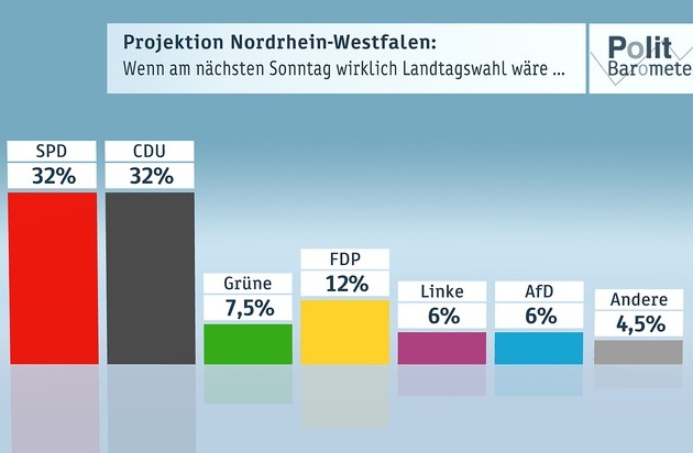 Wenn schon am nächsten Sonntag gewählt würde, dann ergäben sich folgende Projektionswerte für die Parteien: Die SPD käme zurzeit auf 32 Prozent, die CDU ebenfalls auf 32 Prozent, die Grünen könnten mit 7,5 Prozent rechnen, die FDP würde 12 Prozent erreichen, die Linke 6 Prozent und die AfD 6 Prozent. Die anderen Parteien lägen zusammen bei 4,5 Prozent. Damit hätte die amtierende Koalition aus SPD und Grünen keine parlamentarische Mehrheit mehr. Reichen würde es für eine große Koalition aus SPD und CDU oder für eine Ampelkoalition aus SPD, Grünen und FDP oder eine "Jamaika-Koalition" aus CDU, Grünen und FDP, nicht aber für Rot-Rot-Grün.