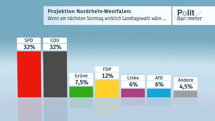 Wenn schon am nächsten Sonntag gewählt würde, dann ergäben sich folgende Projektionswerte für die Parteien: Die SPD käme zurzeit auf 32 Prozent, die CDU ebenfalls auf 32 Prozent, die Grünen könnten mit 7,5 Prozent rechnen, die FDP würde 12 Prozent erreichen, die Linke 6 Prozent und die AfD 6 Prozent. Die anderen Parteien lägen zusammen bei 4,5 Prozent. Damit hätte die amtierende Koalition aus SPD und Grünen keine parlamentarische Mehrheit mehr. Reichen würde es für eine große Koalition aus SPD und CDU oder für eine Ampelkoalition aus SPD, Grünen und FDP oder eine "Jamaika-Koalition" aus CDU, Grünen und FDP, nicht aber für Rot-Rot-Grün.
