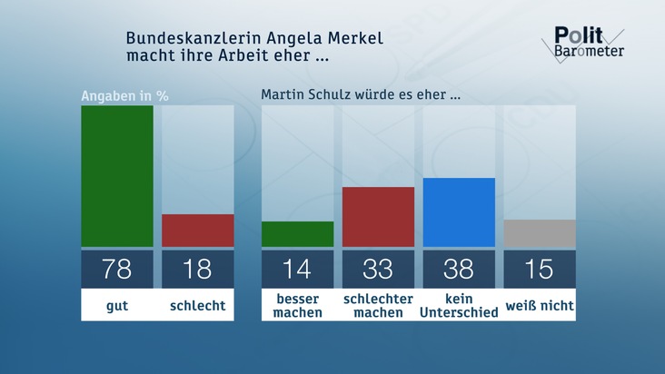 Die Umfrage zum Politbarometer wurde wie immer von der Mannheimer Forschungsgruppe Wahlen durchgeführt. Die Interviews wurden in der Zeit vom 20. Juni bis 22. Juni 2017 bei 1261 zufällig ausgewählten Wahlberechtigten telefonisch erhoben. Die Befragung ist repräsentativ für die wahlberechtigte Bevölkerung in Deutschland. Der Fehlerbereich beträgt bei einem Anteilswert von 40 Prozent rund +/- drei Prozentpunkte und bei einem Anteilswert von 10 Prozent rund +/- zwei Prozentpunkte. Daten zur politischen Stimmung: CDU/CSU: 44 Prozent, SPD: 25 Prozent, Linke: 8 Prozent, Grüne: 8 Prozent, FDP: 7 Prozent, AfD: 5 Prozent.