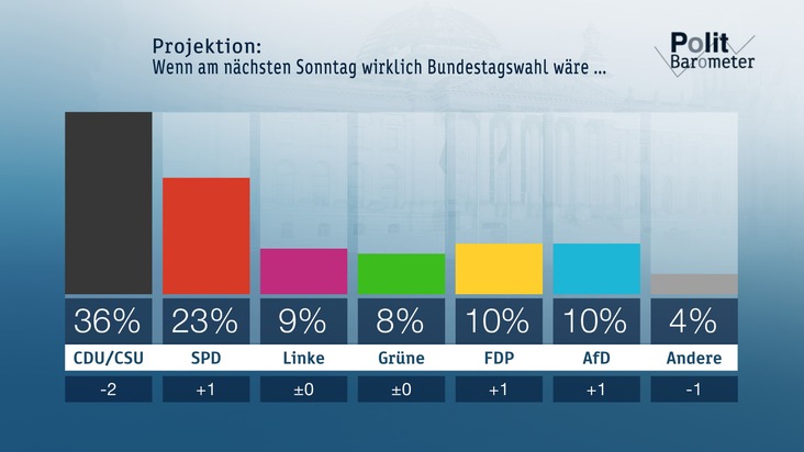 In der Politbarometer-Projektion verliert die Union weitere zwei Prozentpunkte. Wenn schon am nächsten Sonntag Bundestagswahl wäre, käme die CDU/CSU jetzt auf 36 Prozent (minus 2), die SPD auf 23 Prozent (plus 1), die Linke erreichte unverändert 9 Prozent und die Grünen unverändert 8 Prozent. Die FDP käme auf 10 Prozent (plus 1) und auch die AfD könnte auf 10 Prozent (plus 1) zulegen. Die anderen Parteien zusammen erhielten 4 Prozent (minus 1). Damit gäbe es neben einer großen Koalition weiterhin nur eine Mehrheit für eine Regierung aus CDU/CSU, Grüne und FDP. Für alle anderen politisch realistischen Koalitionen würde es nicht reichen.