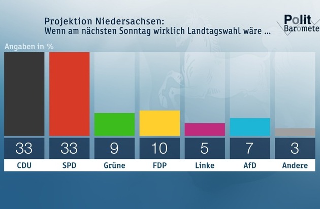 Gut eine Woche vor der Landtagswahl in Niedersachsen liegen CDU und SPD gleichauf, die FDP könnte knapp vor den Grünen drittstärkste Kraft werden, während die AfD mit einem deutlich schlechteren Ergebnis rechnen müsste als vor zwei Wochen bei der Bundestagswahl. Ob die Linke den Einzug in den Landtag schafft, bleibt unklar.