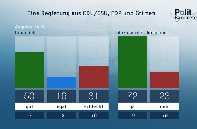 Die langwierigen Sondierungsverhandlungen haben die vormals sehr deutliche Unterstützung für eine Koalition aus CDU, CSU, FDP und Grünen geringer werden lassen: Nur noch 50 Prozent (minus 7) fänden es gut, wenn es zu einer solchen Regierung käme, 31 Prozent (plus 6) fänden das schlecht, und 16 Prozent (plus 2) wäre es egal (Rest zu 100 Prozent hier und im Folgenden jeweils "weiß nicht").