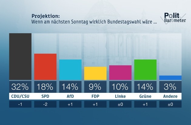 Nach dem Asylstreit haben alle Regierungsparteien Einbußen zu verzeichnen. Wenn am nächsten Sonntag wirklich Bundestagswahl wäre, käme die Union auf 32 Prozent (minus 1). Die SPD erreichte nur noch 18 Prozent (minus 2). Zugewinne hätten dagegen die AfD mit 14 Prozent (plus 1), die FDP mit 9 Prozent (plus 1) und die Grünen mit 14 Prozent (plus 1). Die Linke bliebe unverändert bei 10 Prozent und die anderen Parteien erreichten zusammen erneut 3 Prozent. Neben einer großen Koalition hätte damit von den derzeit politisch denkbaren Bündnissen nur eine Jamaika-Koalition aus CDU/CSU, FDP und Grünen eine parlamentarische Mehrheit.