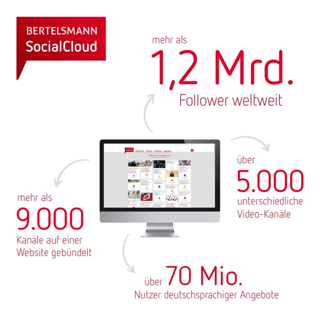 Gebündelt wird die Social-Media-Welt von Bertelsmann auf einer eigenen Website - der Social Cloud (socialcloud.bertelsmann.com). Inzwischen können Nutzer hier in mehr als 9.000 unterschiedlichen Kanälen stöbern oder sich gezielt an der thematischen Sortierung orientieren. Die Bandbreite reicht von Modetipps über aktuelle News, Angebote für Kinder und Musikvideos bis zu Kochrezepten und Literaturempfehlungen. Die Mehrzahl der Nutzer greift dabei auf englischsprachige Angebote zu, auch die Nachfrage nach spanischen Inhalten wächst stark. Mit über 70 Millionen Nutzern deutschsprachiger Angebote erreicht Bertelsmann auch im heimischen Markt ein großes Publikum.