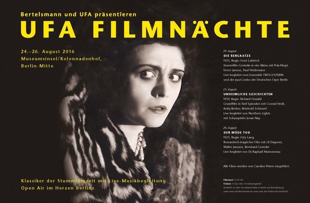 Auch in ihrem sechsten Jahr erweisen sich die UFA Filmnächte in Berlin wieder als Publikumsmagnet: Das am Mittwoch startende Stummfilm-Festival ist an allen drei Abenden bereits weitgehend ausverkauft. Zum Auftakt zeigen die beiden Veranstalter - das internationale Medienunternehmen Bertelsmann und die führende deutsche Filmproduktionsgesellschaft UFA - vor der spektakulären Kulisse des Kolonnadenhofs der Museumsinsel Ernst Lubitschs Meisterwerk "Die Bergkatze" von 1921. Musikalisch begleitet wird der Film von der Formation Trioglyzerin und der JazzCombo der Deutschen Oper Berlin.
