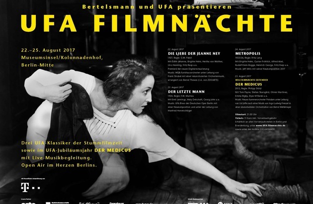 DIE LIEBE DER JEANNE NEY (1927), Regie: G.W. Pabst Mit Édith Jéhanne, Brigitte Helm, Hertha von Walther, Uno Henning, Fritz Rasp u.a. Premiere der neuen Digitalrestaurierung Musik: WDR Funkhausorchester unter Leitung von Frank Strobel mit einer rekonstruierten Orchestermusik, arrangiert von Bernd Thewes (i.A. von ZDF/ARTE) Mittwoch, 23. August 2017, Einlass: 20:30 Uhr, Filmbeginn: 21:00 Uhr DER LETZTE MANN (1924), Regie: F.W. Murnau Mit Emil Jannings, Maly Delschaft, Georg John u.a. Musik: UFA Brass der Deutschen Oper Berlin unter der Leitung von Manfred Honetschläger mit einer Neukomposition von Manfred Honetschläger Donnerstag, 24. August 2017, Einlass: 20:30 Uhr, Filmbeginn: 21:00 Uhr METROPOLIS (1925/26), Regie: Fritz Lang Mit Brigitte Helm, Gustav Fröhlich, Alfred Abel, Rudolf Klein-Rogge, Heinrich George, Fritz Rasp u.a. Musik: Jeff Mills mit einer Neukomposition Freitag, 25. August 2017, Einlass: 20:30 Uhr, Filmbeginn: 21:00 Uhr UFA FILMNÄCHTE EXTENDED DER MEDICUS (2013), Regie: Philipp Stölzl Mit Tom Payne, Stellan Skarsgård, Olivier Martinez, Emma Rigby, Elyas M'Barek u.a. Musik: Neues Kammerorchester Potsdam unter Leitung von Ud Joffe nach einer Musik von Ingo Ludwig Frenzel in einer überarbeiteten Orchestration von Bernd Wefelmeyer