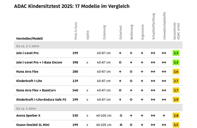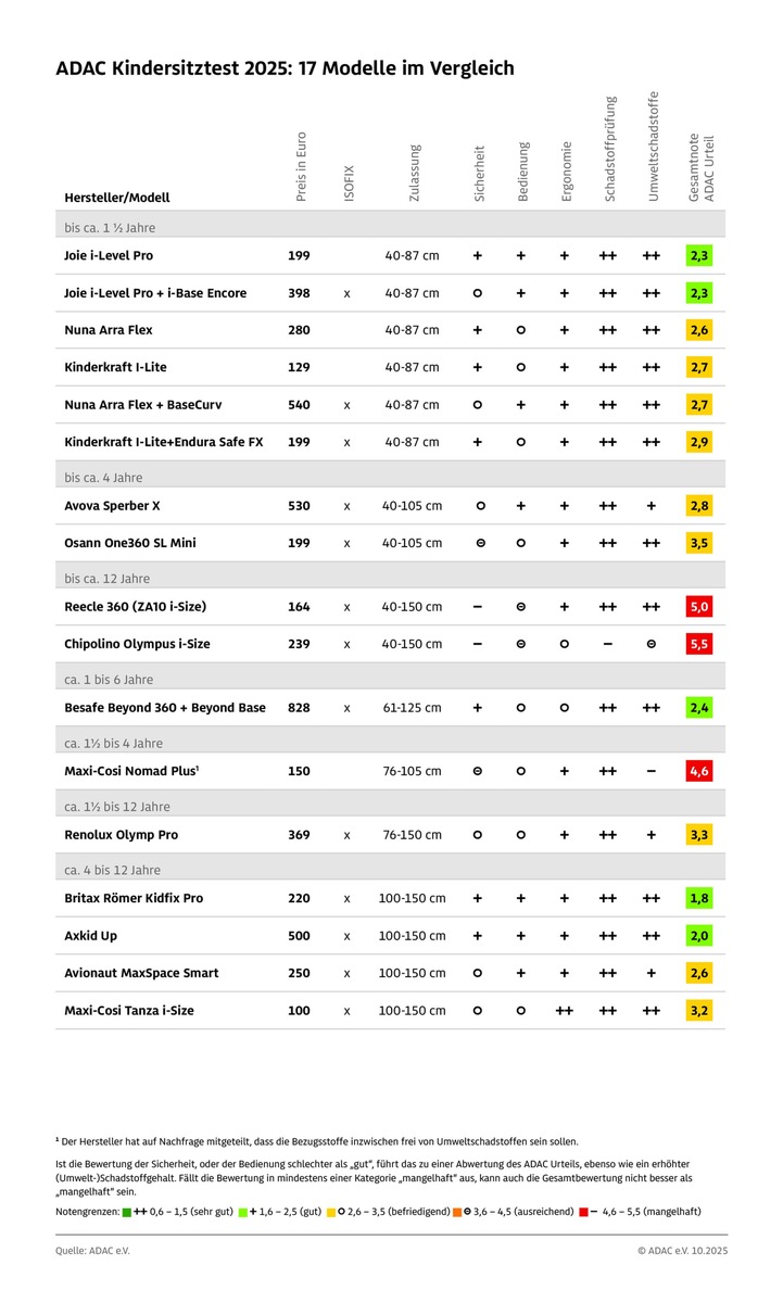 Der ADAC hat seinen zweiten Kindersitztest im Jahr 2025 durchgeführt. Insgesamt waren 17 Produkte (sechs Babyschalen, elf Kindersitze) im Testfeld vertreten, von denen fünf das ADAC Urteil "gut" erreichen konnten. Drei Produkte können hingegen nicht empfohlen werden. Beim ADAC Kindersitztest fließen neben den Ergebnissen aus den Crashtests auch Bedien- und Ergonomie- sowie Schadstoff- und Umweltschadstoffprüfungen in die Bewertung ein.