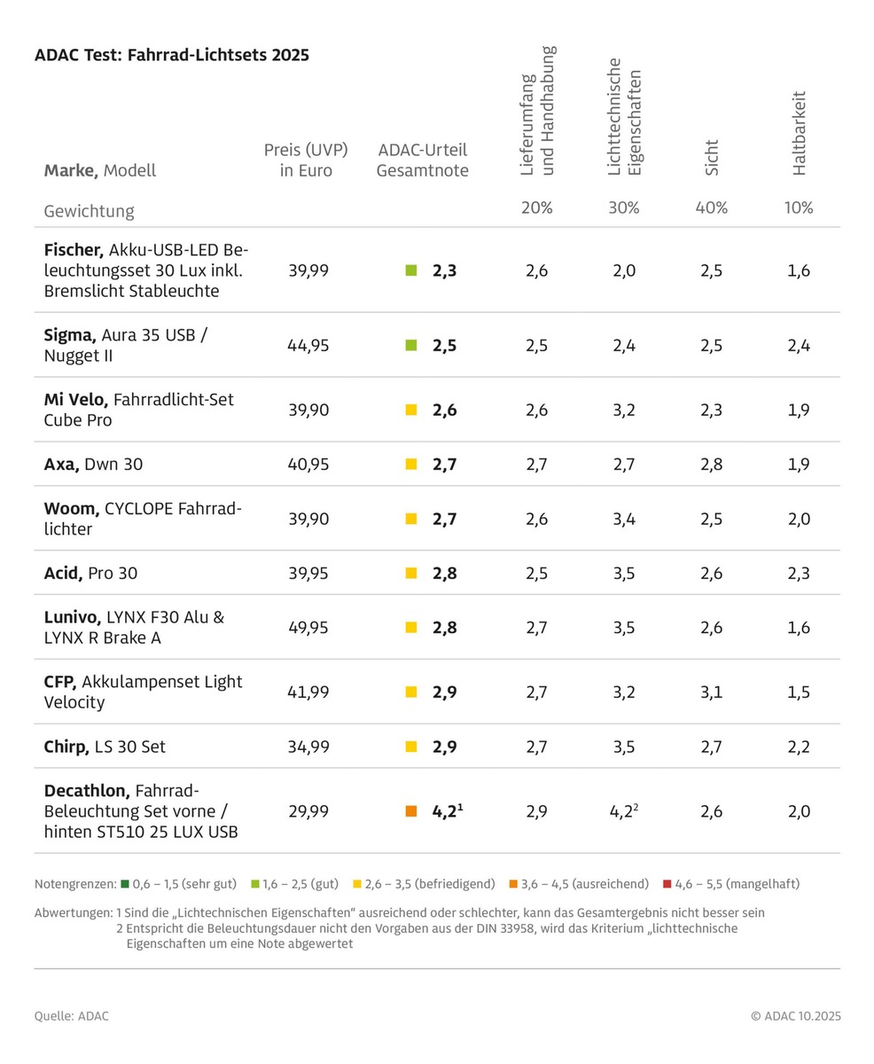 Der ADAC hat zudem zehn Lichtsets mit Front- und Rückleuchte bis maximal 50 Euro getestet: Zwei davon (Fischer und Sigma) werden mit dem ADAC Urteil "gut" versehen, sieben sind "befriedigend". Nur das Set von Decathlon (ADAC Urteil 4,2) leistet sich Schwächen, da es die vorgeschriebene Mindestleuchtdauer nicht erreicht und das Rücklicht vergleichsweise schlecht wahrzunehmen ist.
