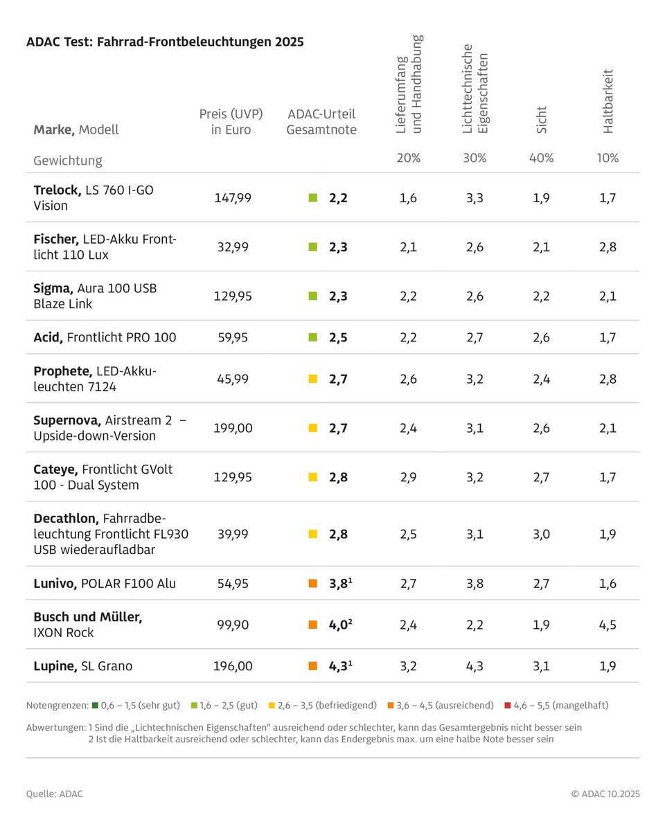 Bei den Frontscheinwerfern lag der Fokus des Tests auf Produkten mit etwa 100 Lux Beleuchtungsstärke und einer StVZO-Freigabe. Im Ergebnis schneiden vier Fahrradscheinwerfer gut ab - und zwar die Produkte von Trelock (Testsieger mit einem ADAC Urteil von 2,2), Fischer (2,3), Sigma (2,3) und Acid (2,5). Dass eine gute Leuchte nicht teuer sein muss, zeigt das Produkt von Fischer mit einem Anschaffungspreis von knapp 33 Euro. Vier weitere Frontleuchten erreichen befriedigende Ergebnisse.