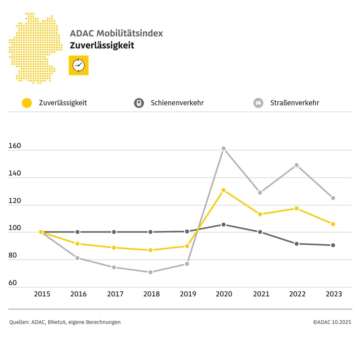 Eine deutliche Verschlechterung zeigt sich hingegen bei der "Zuverlässigkeit", die von 117 im Jahr 2022 auf 106 regelrecht abstürzte. So gab es im Straßenverkehr aufgrund des gestiegenen Verkehrsaufkommens und der steigenden Zahl an Baustellen wieder mehr Staus als 2022. Im Schienenverkehr verschlechterte sich die Pünktlichkeit. Dabei ist die anhaltende Unzuverlässigkeit, insbesondere im Fernverkehr, die Folge langfristig gewachsener struktureller Defizite.